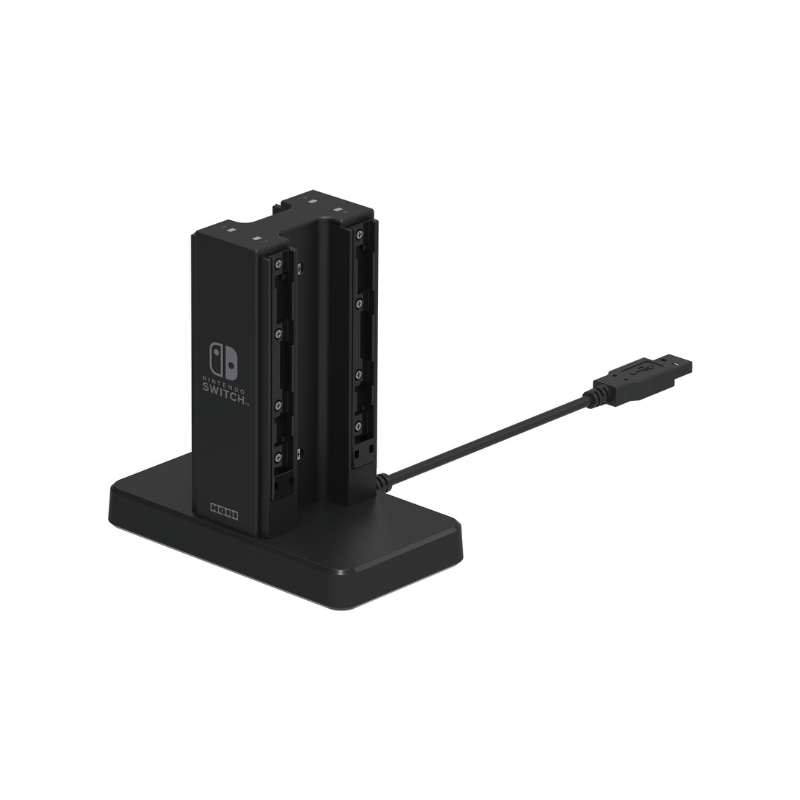 Наполнете до 4 Joy-Con™ одеднаш со пригодниот Nintendo Switch Joy-Con™ Charge Stand by HORI. Едноставно приклучете го на Nintendo Switch Dock и лизгајте Joy-Con™ на безбедни шини. LED индикаторите се исклучуваат кога се целосно наполнети.